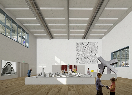 In het plan worden alle kenmerkende elementen van de bestaande architectuur behouden. De opengewerkte en geherstructureerde showroom wordt het visitekaartje van KANAL - Centre Pompidou: beneden is er ruimte voor installaties, performances en concerten, op de bovenverdieping komt een restaurant.