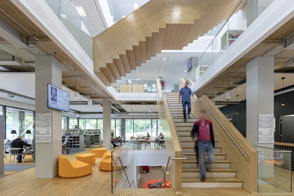 Stadkamer is voor het grootste deel gerealiseerd binnen het bestaande casco. Nieuwe vides zorgen voor licht, lucht en zicht en maken een doorlopende en spannende route mogelijk, meldt JHK Architecten. In de vides hangen trappen die wisselen van richting zodat er een spannend ruimtelijk spel ontstaat en de levendigheid in het gebouw kan toenemen.