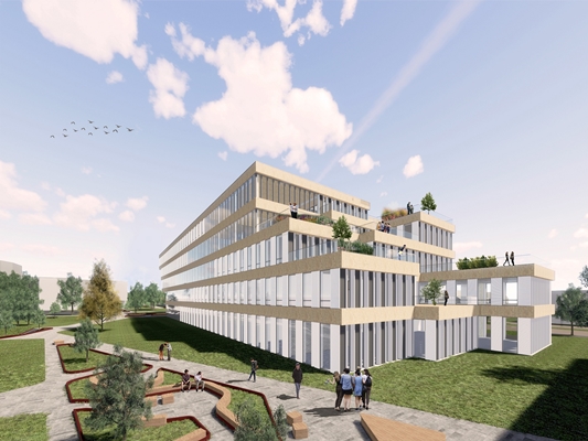 De nieuwbouw wordt zorgvuldig ingepast in de omgeving, met maximaal behoud van de groenstructuur, belooft Ector Hoogstad. In de hoofdvorm wordt verbinding gezocht met de campus; aan de oostzijde wordt met behulp van overstekken een entree in het hart van de campus gecreëerd. Aan de westzijde loopt het gebouw terrasgewijs op, zodat alle verdiepingen contact hebben met het maaiveld.