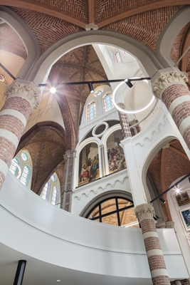 De oude kerk zelf biedt voornamelijk ruimte aan de bibliotheek. Om de ruimtelijke kwaliteit te bewaren, is de tussenvloer voornamelijk in de zijbeuken geplaatst. De vloer zorgt niet alleen voor een frisse uitstaling die past bij de nieuwe functie, maar biedt ook een spectaculair perspectief op de kerk.