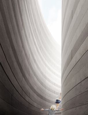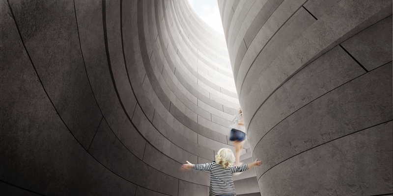, refereert aan de vorming van het omliggende landschap door de ijstijden. Het idee is om een ‘grondboring’ terug in de tijd te maken, wat zichtbaar is gemaakt door de verschillende (aard)lagen in de gevel.