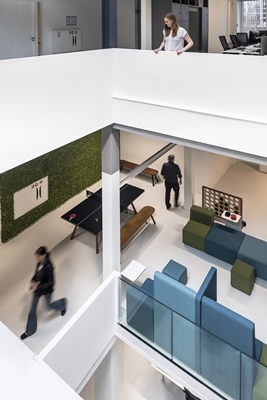 In het hart van het gebouw, nabij de atria, ligt de fun-omgeving. Hier kunnen medewerkers en bezoekers even ontsnappen aan het kantoorleven. Er is ruimte om zowel collectief als individueel te ontspannen, dankzij spelelementen en informeel meubilair.