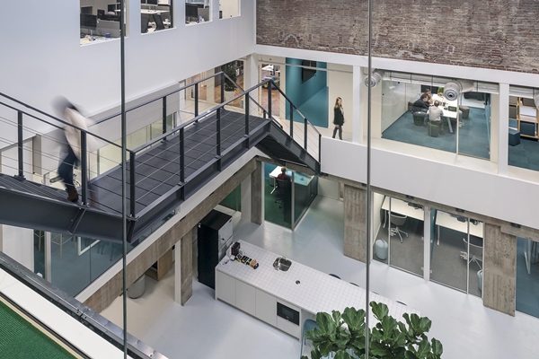 Onder de schuimrubberen punten kwamen metselwerk muren tevoorschijn, die het atrium een bijzondere uitstraling geven, vertelt OTH. Nieuwe, stalen trappen verbinden de omliggende verdiepingen. Even verderop zorgt een tweede, kleiner atrium voor nog meer visuele verbinding tussen de verdiepingen.