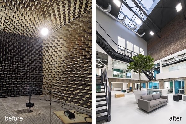 Het voormalige laboratoriumgebouw HTC-36 is voor de nieuwe functie intern volledig gestript. Centraal in het gebouw bevond zich over drie verdiepingen een zogenaamde ‘dode’ kamer, een ruimte rondom voorzien van schuimrubberen punten om geluid volledig te absorberen. In de nieuwe situatie is de dode kamer opengebroken en omgevormd tot een ruimtelijk atrium, dat daglicht diep in het gebouw brengt.