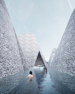 COBE en Inside Out. Het gebouw, dat op een hoek van het plan komt te staan, bestaat uit een compositie van bakstenen volumes met variërende groottes, waarin, onder en rondom baden worden gerealiseerd.