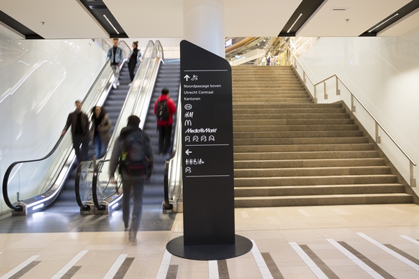 De winkelpromenade is voorzien van bankjes met afgeronde hoekjes. De ronde vormen komen ook terug in de wegbewijzeringsborden.