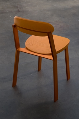 Naast een uitvoering in blank essenhout en aluminium is er ook een volledig zwarte en een volledig oranje uitvoering. De stoel is stapelbaar.