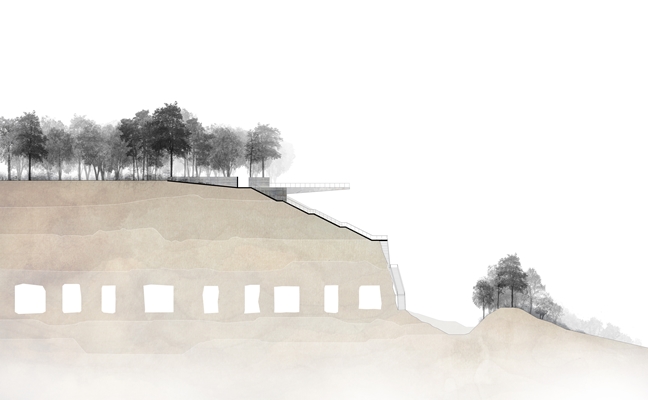 Het ontwerp van Rademacher de Vries Architecten vormt een schilderachtige route, die begint op het plateau van de Sint-Pietersberg en stapsgewijs de steengroeve onthult. Twee betonnen wanden begeleiden de bezoeker door een vegetatiestrook naar een panoramisch uitkijkplatform. Daar heeft de bezoeker zicht op een verrassend door mensenhanden gecreëerd landschap, met steile wanden die ongewoon zijn in Nederland.