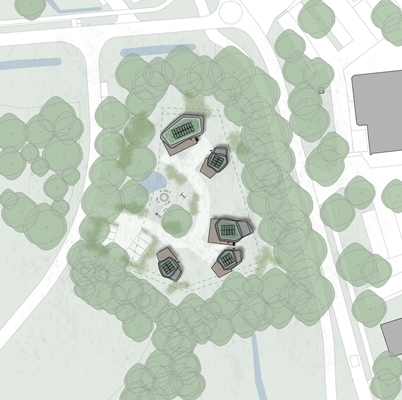De vijf woningen zullen in een halve cirkel worden geplaatst. Tussen het ensemble is ruimte voor een gemeenschappelijke speel- en ontmoetingsplek. Zichtlijnen door en naar het omliggende bomenrijke gebied en de grote gevelopeningen van de woningen versterken de relatie tussen binnen en buiten.