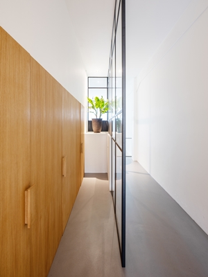 De drie deuren naar badkamer, wasruimte en toilet zijn visueel gebundeld, legt FELD uit. Het eikenhout is in een enkele beweging doorgetrokken tot een integraal houten element.