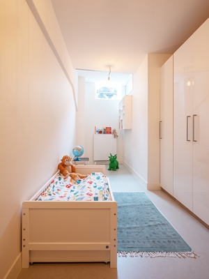 In het souterrain heeft FELD twee kinderkamers gerealiseerd. Een verspringing in de scheidingswand tussen deze kamers biedt ruimte voor kasten aan beide zijden. Door een bovenlicht in de tussenwand ogen de kamers lichter.