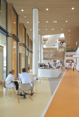 Het hout draagt tevens bij aan de overgang van binnen naar buiten. De massief houten lamellen aan de buitenkant zorgen voor een warme en natuurlijke uitstraling, het hout in het interieur verzacht de overgang naar de medische binnenwereld. Als onderdeel van het natuurlijke verloop fungeert de hoofdroute door het gebouw als een ‘ontmoetingsplaats’ voor de verschillende gebruikers.