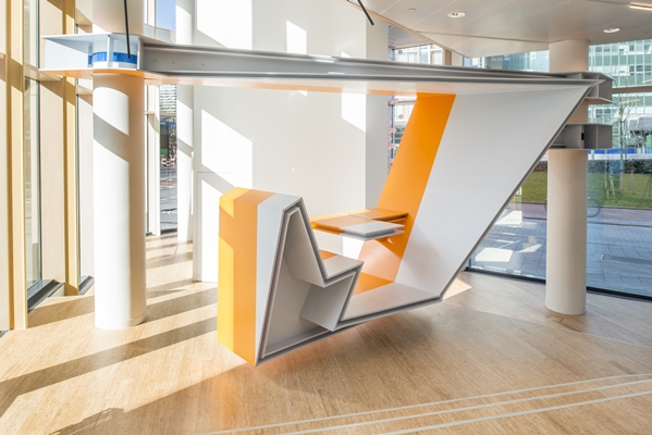 De KAPKAR/WS1P-AN is uitgevoerd in Havermans’ vertrouwde beeldtaal: met scherpe hoeken en rechte lijnen, enerzijds futuristisch, anderzijds refererend aan industriële architectuur. De functionele installatie is vervaardigd uit multiplex en afgewerkt in de AkzoNobel-kleuren voor de nieuwe McLaren F1-auto MCL33, genaamd Papaya Spark en Burton Blue.