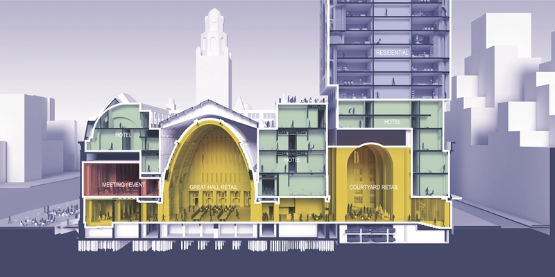 zag echter wel brood in het pand, zeker na de recente opleving van Rotterdam als stad en de in uitvoering zijnde herinrichting van de Coolsingel (waar voetgangers en fietsers meer de ruimte krijgen). Het gebouw zou kunnen uitgroeien tot een ‘schakel’ in het centrum, zoals de Markthal, de Lijnbaan en het centraal station dat ook zijn. Een ‘poreus’ complex met verschillende commerciële functies, waar het publiek net zo vanzelfsprekend doorheen wandelt als de Koopgoot.