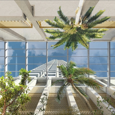 Vanuit de lobby en vanaf de eerste verdieping voeren shuttle-liften naar het panoramadek en het restaurant in de top van de toren. Dit deel wordt eveneens zo transparant mogelijk uitgevoerd, in staal en glas, zodat de toren als het ware oplost in de lucht.