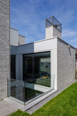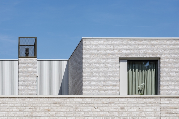 Voor ingesneden vlakken heeft FAAM architects een andere materialisering gekozen dan voor de uitstekende vlakken. De ingesneden vlakken zijn uitgevoerd in hetzelfde materiaal als de ruimte tussen raamkozijn en de gevelopening in het lichte metselwerk.
