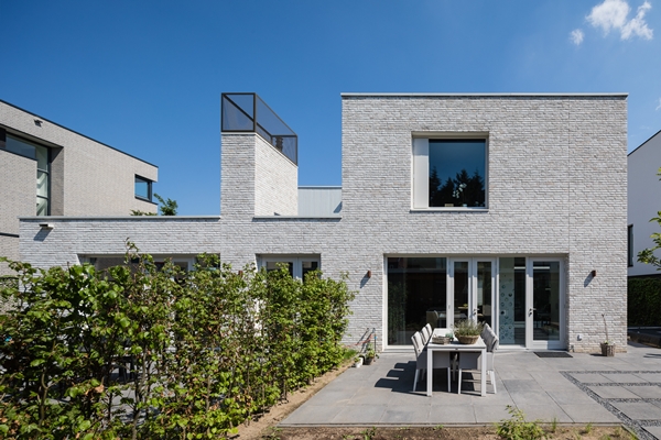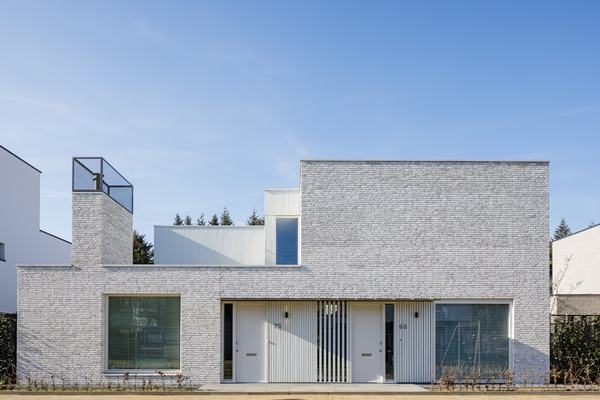 De geschakelde woonhuizen ogen niet direct als zodanig. FAAM architects heeft de twee woningen wat betreft massaopbouw dubbel gespiegeld: zowel in de lengte als in de breedte. Door deze ”puntsymmetrie pur sang”, aldus het architectenbureau, heeft het een opeenvolging van kubische vormen gecreëerd die tegelijk logisch en willekeurig lijkt.