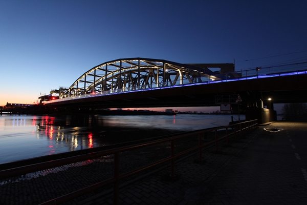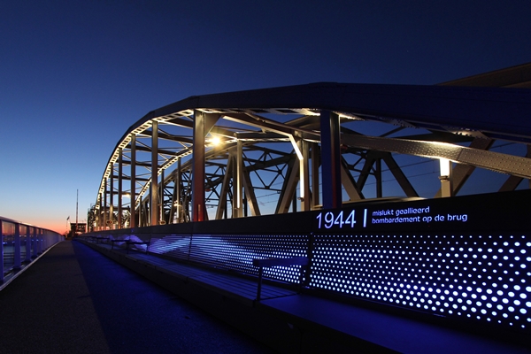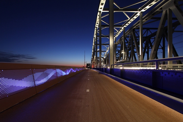 De voetgangers worden via een opstand annex zitbank over de hele lengte van de brug gescheiden van de fietsers. De opstand is voorzien van perforaties en interne verlichting, waardoor de brug als het donker is op bijzondere wijze is verlicht. In de opstand is tevens een tijdlijn van de historie van de brug en de stad verwerkt.