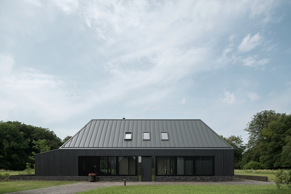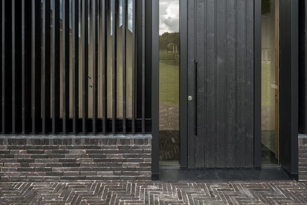 In het project is de bekende typologie van de boerenschuur vertaalt in een eigentijdse, bewoonbare variant. “Het binnenerf oogt door de donkere kleurstellingen en houten lamellen ingetogen en privaat”, stelt Van der Salm. “In de overige gevels bieden hoge puien ongelimiteerd zicht op het landschap.“