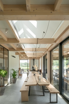 De schuurwoningen zelf zijn opgebouwd uit een maatwerk houten hoofddraagstructuur zonder zichtbare verbindingselementen. “De constructie heeft zo, buiten de dragende functie, tevens het karakter van een meubel gekregen. Deze is zichtbaar gebleven en refereert naar de schuur; helder, pragmatisch en sober, echter wel scherp gedetailleerd”, aldus Van der Salm. “Geen oplossingen vanuit complexiteit of uiterlijke sier, de ontwerpbeslissingen zijn enkel beredeneerd vanuit materialiteit, tektoniek en het landschap.”