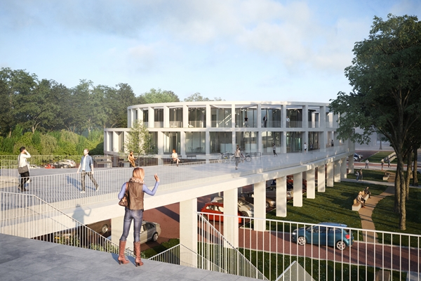 De beoogde locatie ligt als het ware aan ‘het kruispunt’ van Rhoon, legt Gortemaker Algra Feenstra uit: naast het metrostation en de Groene Kruisweg en aansluitend op het viaduct dat het winkelcentrum met het kasteel verbindt. Om hier optimaal op aan te sluiten tilt het architectenbureau het gebouw op tot op het niveau van het viaduct.