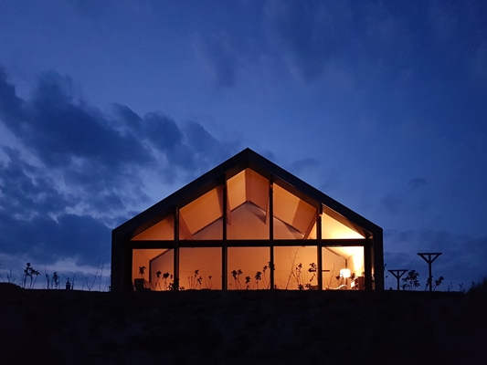 De zuidgevel kenmerkt zich door een robuust stalen frame en zware gelamineerde houten balken en liggers. Met de gekozen dakvorm hebben de architecten gestreefd naar een vloeiende aansluiting van het dakvlak bij het duinlandschap. Ook de houten gevel- en dakbekleding zorgen voor een integratie in de context in plaats van een contrast.
