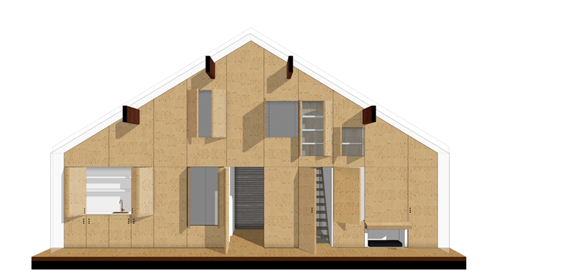2by4-architects heeft het volume ontworpen als houten monoliet, die tegelijk is voorzien van subtiele details. Zo zijn in de gevel veel elementen te openen om op verschillende momenten van de dag licht naar binnen te brengen, leggen de architecten uit.