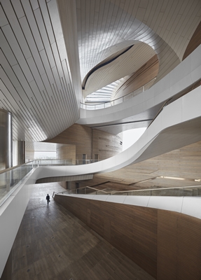 Grote, open 'trechters' doorsnijden het gebouw; tegelijkertijd vormen deze ruimtes met trappartijen de verticale verkeerszones. De openingen veranderen bovendien de gewoonlijke ervaring van een gebouw als obstakel naar de waterkant in die van een vloeibare en makkelijk doorwaadbare ruimte, leggen de architecten uit.