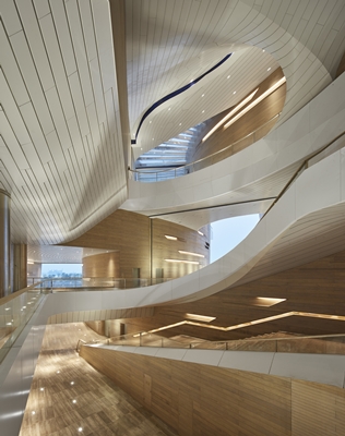 in Azië als een organisch naar de waterkant uitwaaierend gebouw.