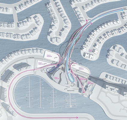 groot en omvat, naast de jachthaven met ligplaatsen, een voorzieningen- of clubgebouw, villa’s in het hoge segment, wegen, een brug en een Customs, Immigration, Quarantine and Port-clearance (CIQP)-gebouw. Het gebied is omsloten door dijken.