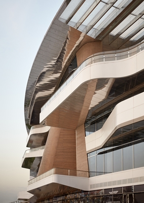 Langs de waterkant is de gevel geheel in glas uitgevoerd, met glazen vinnen als versteviging van de constructie. Lange balkons bieden hier zowel een uitzichtpunt als beschaduwing van de glazen façade. De onderzijde van de balkons is afgewerkt met spiegelend materiaal, “dat lijkt op de de glinsterende reflecties op het wateroppervlak”, aldus UNStudio Asia.