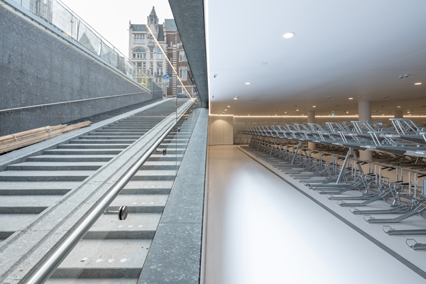 De entrees, trappen en beheerdersruimte van de fietsenstalling zijn afgewerkt met dezelfde natuursteen als het plein. Fietsers worden vanaf de inrit aan het Damrak met een lichte bocht naar beneden begeleid om hun rijwiel te stallen, een tweede entree voor voetgangers koppelt de ondergrondse ruimte aan de naastgelegen Beurs en warenhuis De Bijenkorf.