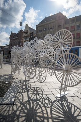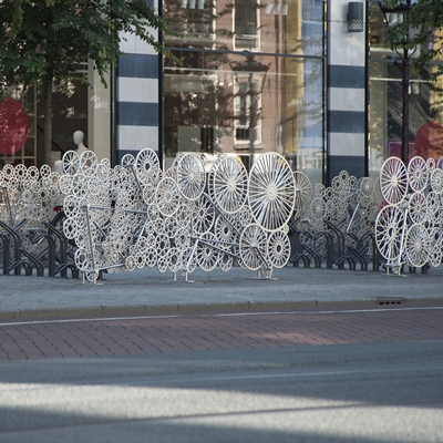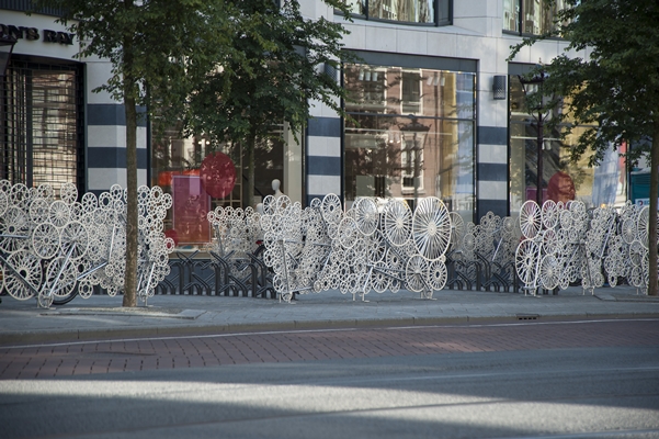 een installatie ontworpen waarin twee hoofdstedelijke fenomenen versmolten zijn: fietswielen en diamanten. Bicycloud is vooral bedoeld als een elegante ‘amalgaam’ voor de beruchte chaos aan geparkeerde fietsen in de stad. Het voegt er een nieuwe visuele laag van cirkels en lijnen aan toe.