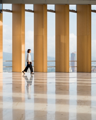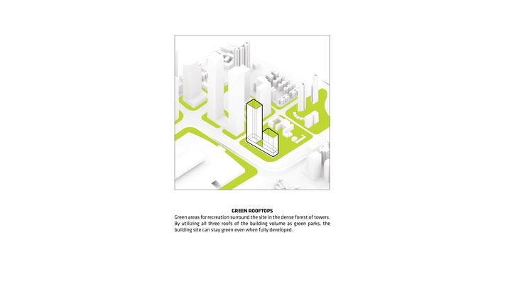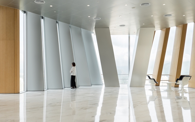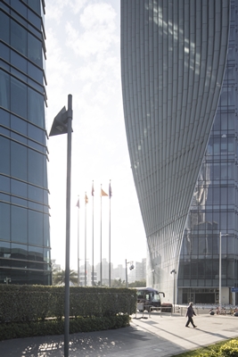 Een en ander wordt versterkt door de ‘vouw’ die in de hoogste van de twee torens is gemaakt. Hier opent zich, net als op enkele andere plaatsen in het complex, de eigenlijke glazen gevel. Dankzij de combinatie van lamellen en de oriëntatie op de zon wordt het energieverbruik van het complex op ‘natuurlijke’ wijze geminimaliseerd, zonder dat daar extra installaties bij benodigd zijn.
