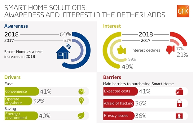 Volgens de recentste peiling van GfK blijkt 49% van de Nederlanders geïnteresseerd of zeer geïnteresseerd te zijn in Smart Home. Dat is een behoorlijke afname met 10% ten opzichte van vorig jaar. Het percentage dat aangeeft geen interesse te hebben, is daarentegen toegenomen: van 17% in 2017 naar 21% in het recente onderzoek.