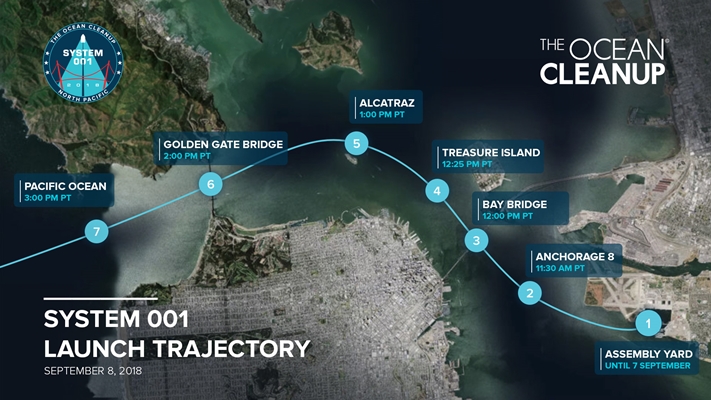 Het eerste gevaarte heet System 001. Dat is de afgelopen maanden in elkaar gezet in San Francisco. Op 8 september vertrekt het. Voor het oog van de wereld wordt deze plasticvanger langs het beroemde gevangeniseiland Alcatraz gesleept. Daarna gaat hij onder de Golden Gate Bridge door de Grote Oceaan op, naar zijn toekomstige werkplek.