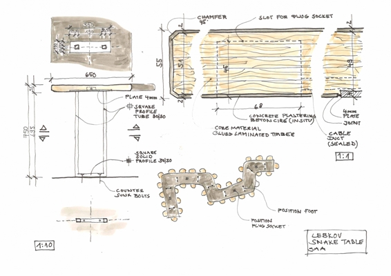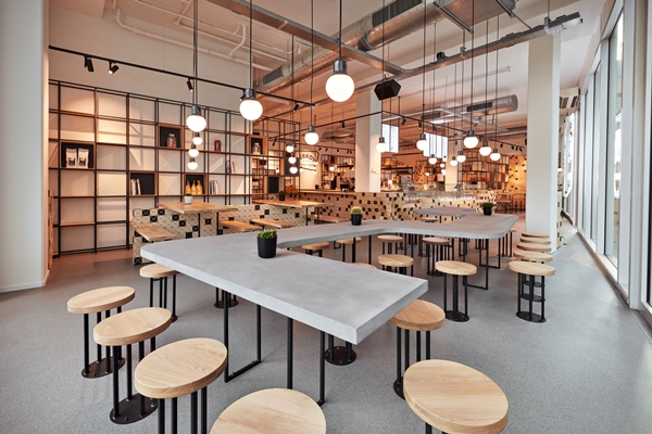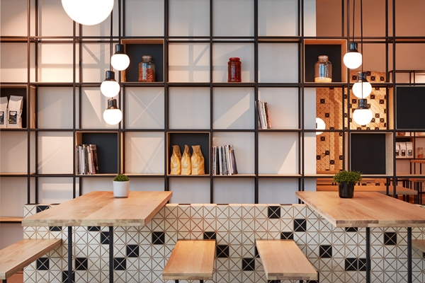 De bar en open keuken zijn centraal gesitueerd; de zitgedeeltes zijn rondom geplaatst en bieden de gasten verrassende plekken. Zo zitten de klanten op houten banken naast de keuken en de open opslagplaats, gezamenlijk aan een meanderende tafel in beton, of op een verhoogd platform waar de betonnen werktafels van de barista’s over de toonbank strekken en gastentafels worden.