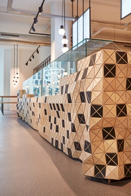 Deze ‘sharing mix’, zoals Lebkov & Sons het concept noemt, wordt verbeeld in het patroon waarin zwarte vierkanten en lichtgetinte vierkanten vermengen. In eerdere vestigingen is dit patroon uitgevoerd in kleine tegels; voor de nieuwe vestiging heeft het ontwerpbureau gekozen voor houten wandbekleding.