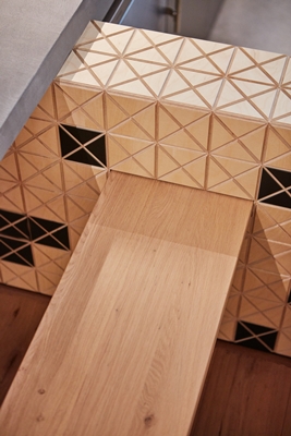 De houten panelen zijn voorzien van een geometrisch patroon van inkepingen, waardoor ze enigszins vormbaar zijn. Studio Akkerhuis voorziet daarmee vaste meubels en wanden in het interieur niet alleen van een houten bekleding, maar op verschillende plekken ook van een beweeglijke structuur. Tegelijkertijd zorgt de bekleding in zwart en naturelle houttint voor eenheid.