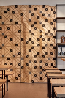 Het kenmerkende ‘Lebkov-patroon’ keert – op een andere schaal – terug in de open opslagruimte, die bestaat uit een modulaire, stalen constructie. Verse producten en koffiebonen kunnen worden gepresenteerd in de schappen en in dozen van hetzelfde houten bekledingsmateriaal, die vrijelijk in de stalen frames zijn te plaatsen.