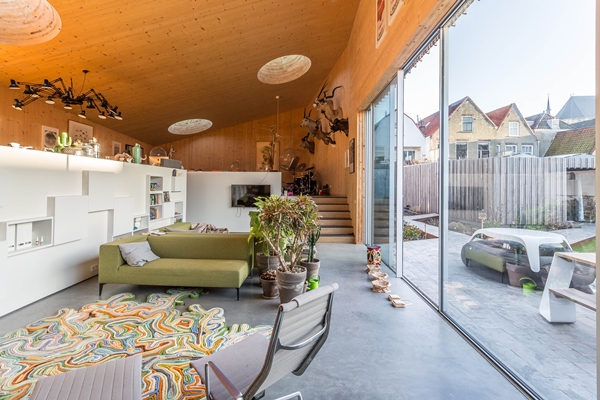 Om geen hele lange heipalen te hoeven toepassen is de woning ontworpen als een soort woonboot die in het grondwater drijft. De grote kelder die uit dit concept ontstond is gebruikt om de slaapkamers in onder te brengen. De grote ruimte daarboven is voorzien van een hoogteverschil, zodat vanaf twee niveaus uitgekeken wordt op de eigen tuin en de oude stad van Delft erachter. De massief houten constructie van de woning, die onbehandeld is gelaten, geeft de woning een heel eigen karakter en maakte de constructie van de daklichten een stuk eenvoudiger. Die daklichten zijn daarbij geen simpele gaten, maar hebben een diepte, vormen een ruimte, en vangen daardoor echt het licht.