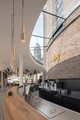 ontwierp hiervoor een glazen ‘omarming’ als uitbreiding. Het interieurontwerp voor deze uitbreiding is gemaakt door