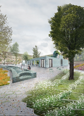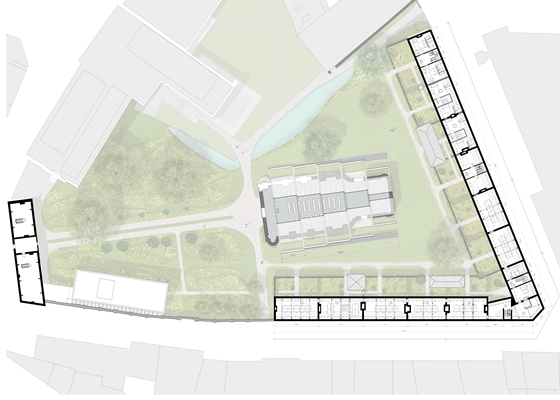 Om niet teveel druk op het oorspronkelijke karakter van de begijnhofwoningen te leggen, stelt team BOB361-Studio Roma voor het verdere gewenste programma ā met onder meer een auditorium en expositieruimte ā te huisvesten in een nieuw gebouw. De plaatsing van dit āStadslabā volgt een historische logica, leggen de architecten uit.