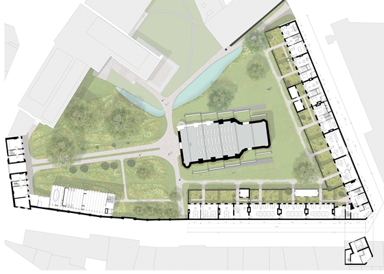 Rondom de oude kerkruĆÆne en de nieuwbouw stellen de architecten een terrein voor dat eveneens vooral groen is, maar wat steenachtiger. Aan een kant loopt een lange, meanderende waterpartij, die moet herinneren aan de Nieuwe Demer, die hier ooit zijn loop had.