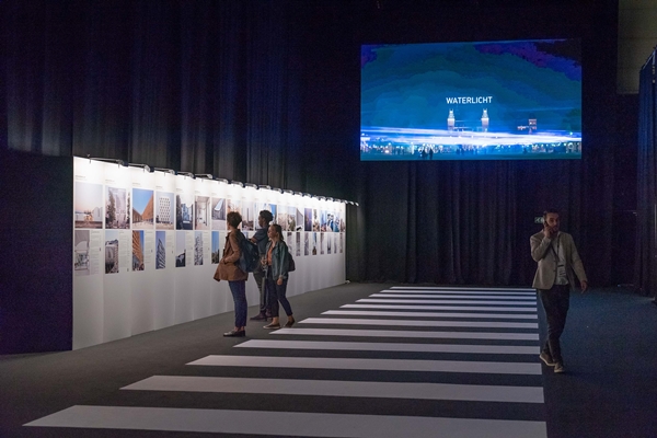 Siderius was dan ook blij verrast om de inrichting van Architect@Work mee te maken: vol contrasten, met relatief donkere foyers en juist zeer lichte stands, met daartussen lichtobjecten en uitgelichte plaatjes op de vloer waarin steeds vier exposanten met hun naam aangekondigd worden. Een zeer uitgesproken en sfeervol lichtconcept, en niemand die er moeite mee had, constateerde Siderius.