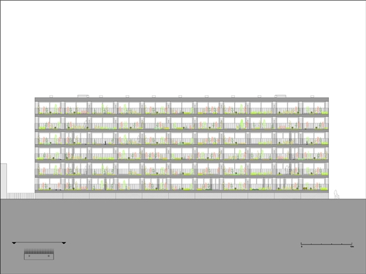 Het woongebouw De Klencke op de Amsterdamse Zuidas kenmerkt zich door een opvallend getrapt profiel. De terrassen aan de zuidzijde, met zicht op de tuinwijk Buitenveldert, zijn voorzien van geïntegreerde plantenbakken, waarmee NL Architects het gebouw tot een schakel tussen stedelijkheid en groen heeft gemaakt.
