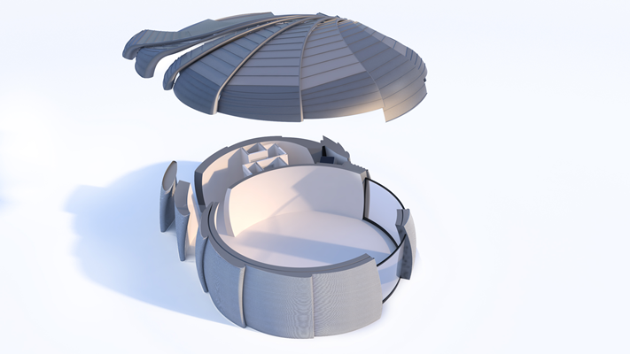 De ‘draaiende’ bladen openen doorzichten of sluiten ze, al naar gelang de positie van de waarnemer. Het gebouw is hierdoor vanaf iedere hoek anders. Een dergelijk ontwerp, met gekromde wanden die alle verschillend van vorm zijn, is met traditionele bouwmethoden niet of nauwelijks te bouwen. Volgens de opdrachtgevers is dat een belangrijke reden om te kiezen voor 3D-printen in beton.