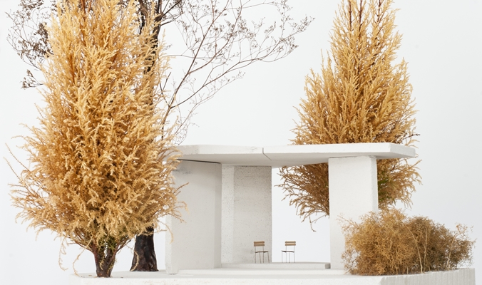 Het bouwwerk lijkt gemaakt te zijn uit de grond waar de omringende planten uit groeien. Terughoudend maar tegelijkertijd onlosmakelijk verbonden met de flora die in deze tuin de hoofdrol speelt."