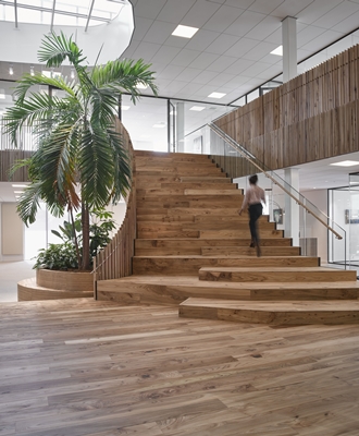 Engelsman had, zo merkte Ex, wel al heel duidelijke ideeën over het interieur. “Hij wilde een keuken, want ze werken natuurlijk met voedsel; hij wilde een grote vide zodat hij zijn medewerkers op de trading floor kon zien, met een brede trap waarop toespraken en lezingen zouden kunnen plaatsvinden. Openhaarden als ontmoetingsplek voor de medewerkers, en ruimtes voor powernaps en meditatie.” De duurzaamheidsvisie strekt zich bij Eosta namelijk ook uit naar het welbevinden van de werknemers.