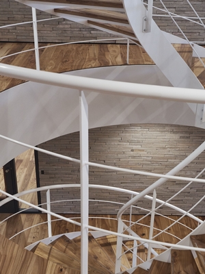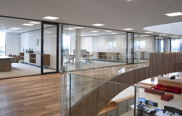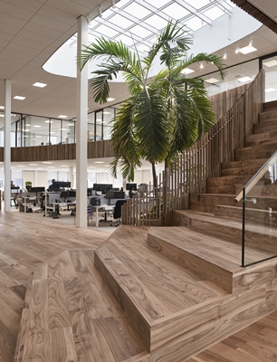 Rondom de handelsvloer zijn op de begane grond diverse overleg-, ontmoetings- en huiskamerplekken met openhaarden gesitueerd. Vanaf de trading floor draait een tribunetrap naar de eerste verdieping, waar de iepenhouten trap overgaat in een organisch gevormde balustrade uit iepenhouten latten en glas.